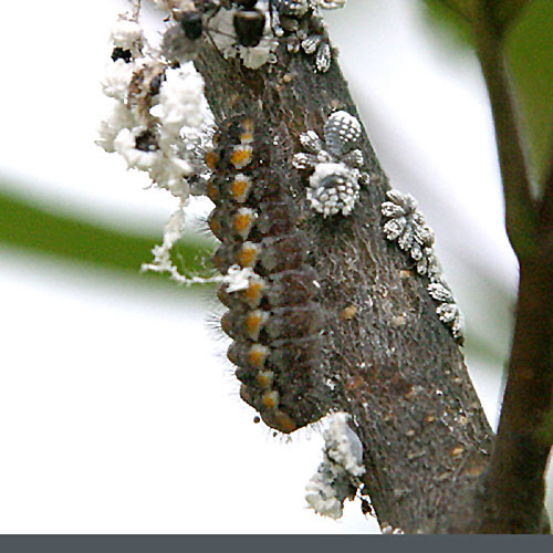 Photo © Dave Small - 5/16/1999 Royalston Female Harvester laying eggs (ovipositing) in a colony of Wolly Aphids. When the caterpillars hatch, they will eat the aphids. | Top of Page